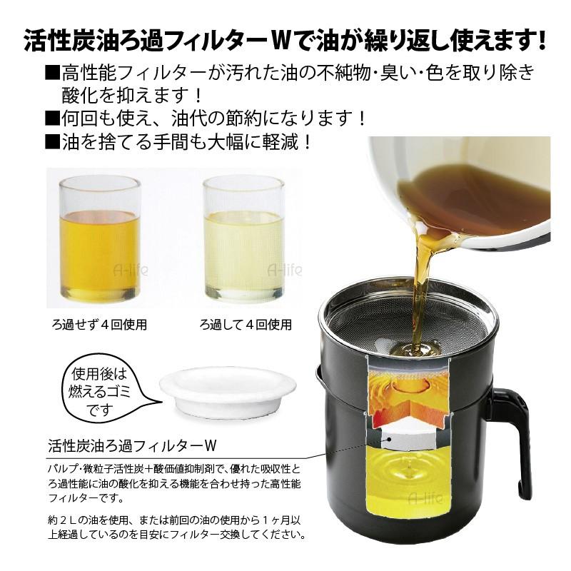 フィルター1個で約2lもの油をろ過することができる。 使い終わったフィルターはそのまま燃えるゴミとして廃棄できるので手間いらず。 ※高性能活性炭フィルター1個付き 関連商品 活性炭ろ過ポットフィルター 2個入り krf2pいいもの見つけた!炭ろ過フィルター 揚げ物調理の後に残った油の不純物・ニオイ・色を取り除きます。a炭ろ過フィルター 交換用 10個組 油 廃油 天ぷら油 植物油 活性炭 炭ろ過 フィルター オイルポット 高木 油ろ過 通販 Yahoo!ショッピングろ過フィルターは油の酸化物の除去、脱臭、脱色をするので、きれいな油を再利用できる。 交換用フィルターはhb2143 カートリッジの交換は2~3ℓが目安。 別売りの「パール金属 メイドインジャパン 活性炭ろ過フィルターα2個組 hb2143」を使用。 安心の日本製
